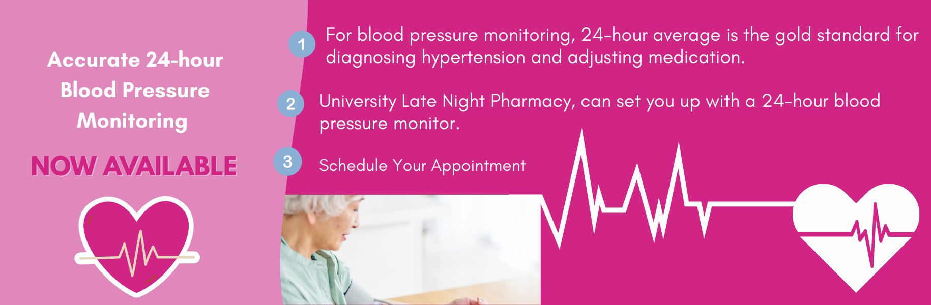 Here at University Late Night Pharmacy, we can set you up with a 24-hour blood pressure monitor. This small cuff and machine check your blood pressure throughout the whole day and night while you go about your normal routine, and it also takes readings while you sleep. This gives a clear picture of what your blood pressure is really like in everyday life. It also helps avoid some of the common problems with one-off readings — for example, some people get higher readings in a clinic because they feel nervous (‘White Coat Hypertension’), while others may have higher blood pressure at home or during the night. A 24-hour monitor helps tell the difference between these patterns and true high blood pressure. For blood pressure monitoring, 24-hour average is the gold standard for diagnosing hypertension and adjusting medication.
