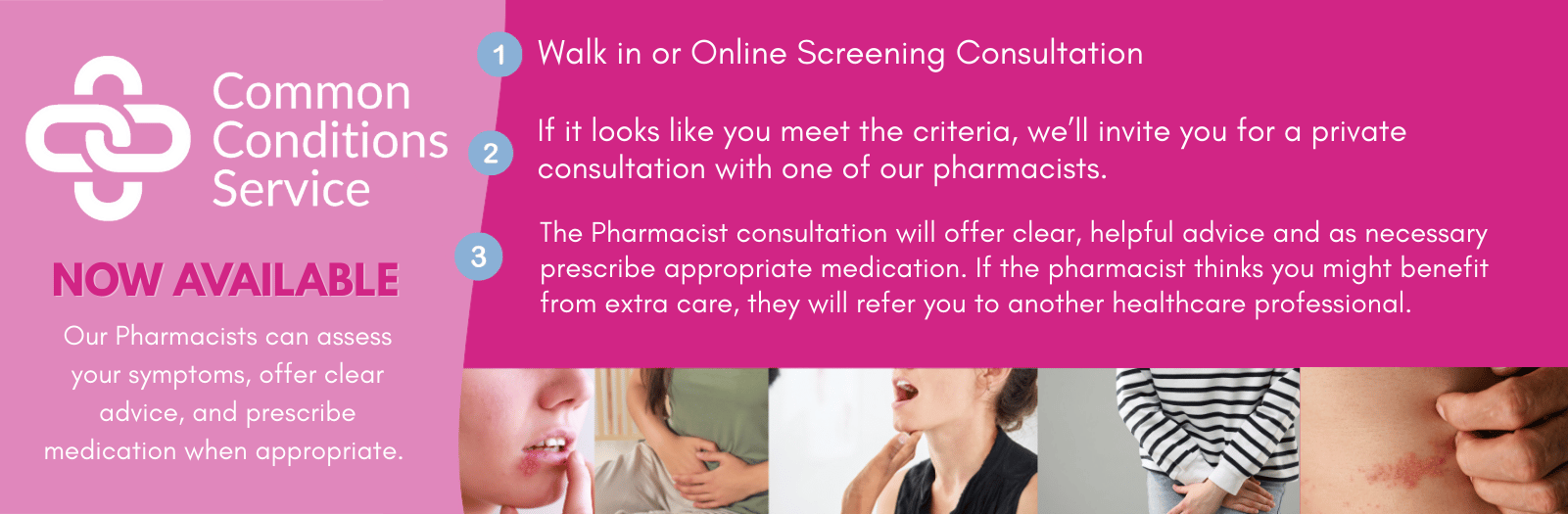 You are welcome to call in to the pharmacy directly and you will be guided through a short condition specific preliminary screening form to assist the pharmacist to see if you meet the HSE Common Conditions Service criteria. You should come to the pharmacy at least 30 minutes before closing time. The pharmacist will see you at the earliest opportunity once the screening process has been completed.